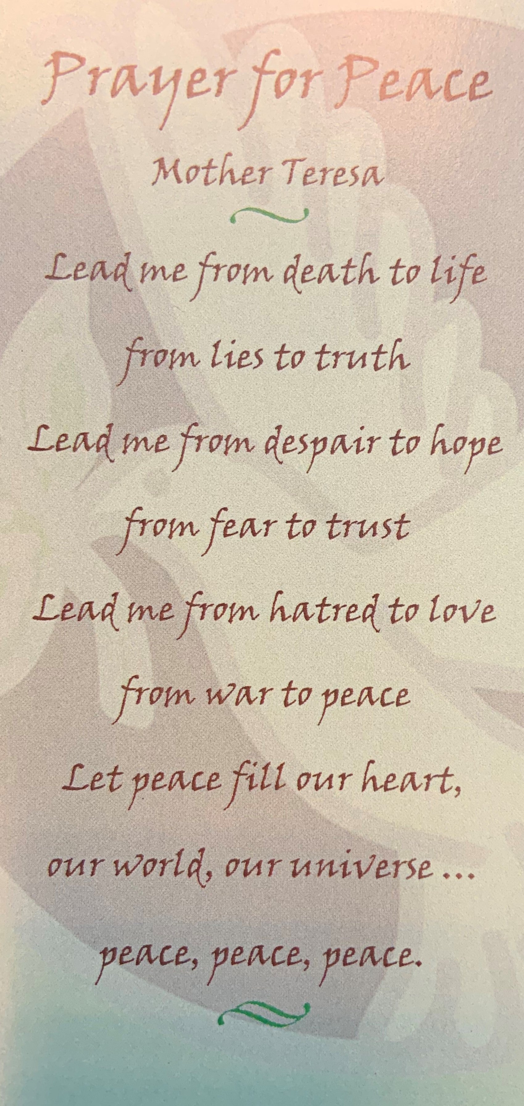 Prayer Card with Mother Theresa's Prayer for Peace card measures 4.5 inches high by 2.5 inches wide.